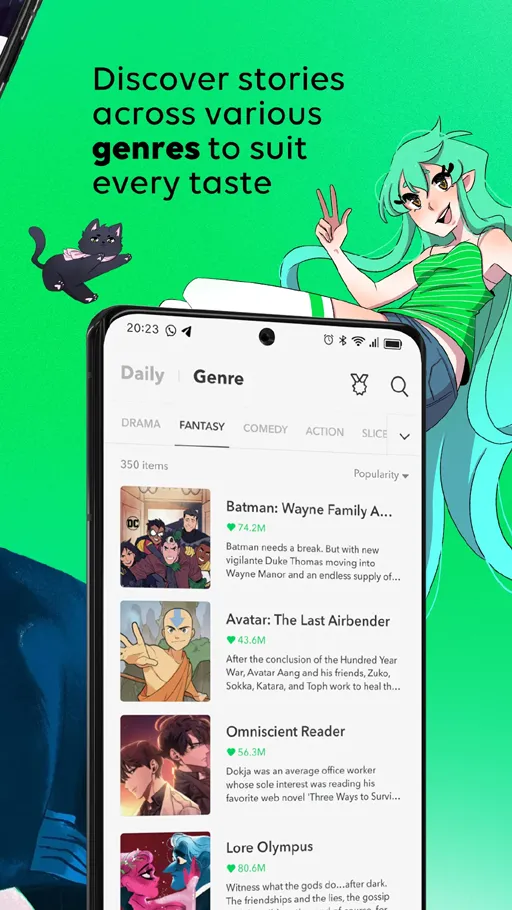 - تنوع الفئات : المميز بالقصص المتوفرة بعد تحميل برنامج WEBTOON مهكر للاندرويد أنها تابعة لفات عديدة بالإضافة لوجود خيارات تصنيف يمكنك تحديد منها الخيار الخاص بالفئة المرادة لكي تظهر جميع المحتويات التابعة للفئة المحددة وبالتالي تحدد القصة المرادة بسهولة.
