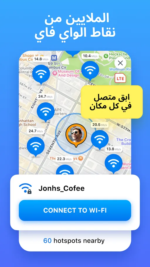 - عرض شبكات الواي فاي : يقدم تحميل تطبيق WIFI Map مهكر خدمة أساسية تتمثل في عرض كافة شبكات الإنترنت أو الواي فاي الموجودة في موقع المستخدم الجغرافي, ويتم الأمر بشكل بسيط بعد الحصول على إذن الوصول أي الموقع والشبكات في التطبيق.