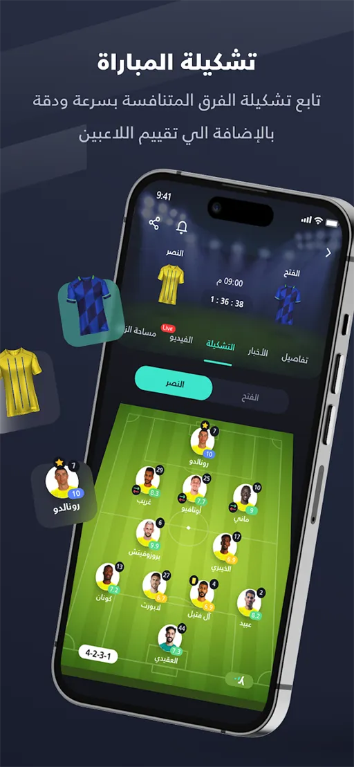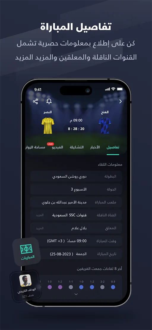 - عرض الإحصائيات : من المعلومات التي تتوفر لك أيضا بعد المباراة هى التحليل التفصيلي عن المباراة والتي بواسطتها يمكن معرفة جميع المعلومات التحليلية بصورة تفصيلية, كما يمكن للمستخدم أيضا الإطلاع على التشكيل الخاص بكلا الفريقين والأخبار الهامة حول الأحداث التي دارت في المباراة من إصابات ولقطات ملفتة للأنظار.