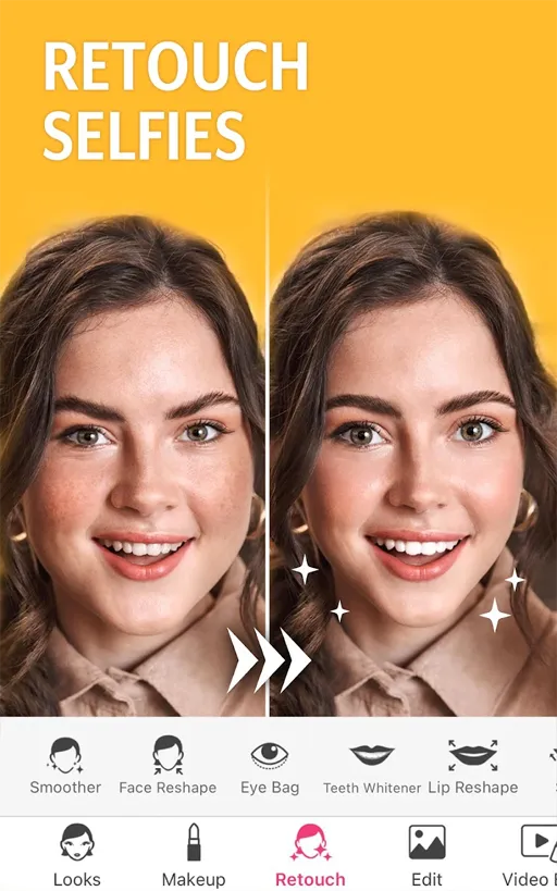 برنامج YouCam Perfect مهكر يعتمد في تلك الخدمة على التقنيات الذكية التي تعمل على تحليل الوجه بكل دقة وبالتالي يتم وضع هذا المكياج دون حدوث أي أخطاء في رسم تلك المكياجات, الجدير بالذكر أنكي تقومي بتحديد التفاصيل الخاصة بتلك المكياج كما تريدي وكأنكي أمام المرآة في المنزل أو في أحد مراكز التجميل الفاخرة, هذا المكياج مثل : أحمر الشفاه الذي يُمكنك تحديد درجة اللون الخاص به بالإضافة لدرجة الوضوح الخاصة بها بجانب تنعيم البشرة وإزالة أي عيوب في البشرة, أيضا تستطيعي الاستمتاع بالعديد من الإطلالات, بالإضافة لإمكانية تبييض الأسنان.