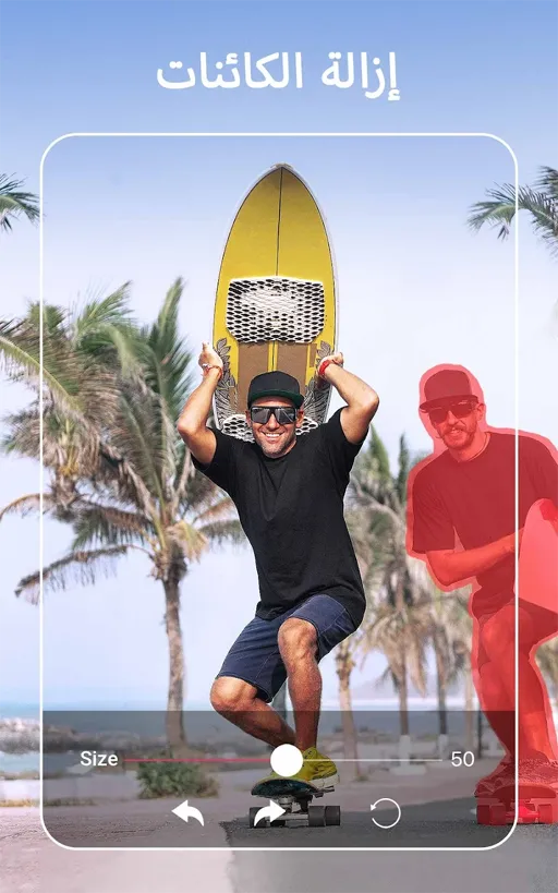 إحدى الأدوات أو أولهم هي أداة ( المسح ) وتقوم بمسح أي شئ لا تريده في الصورة إن كان شخص أو شئ يُقلل من جمال شكلها, ويتم الأمر بأسهل ما يمكن حيث كٌٌل ما عليك فعله هو تحديد الشئ بشكل إحترافي فقط وستقوم الأداة بالمسح.