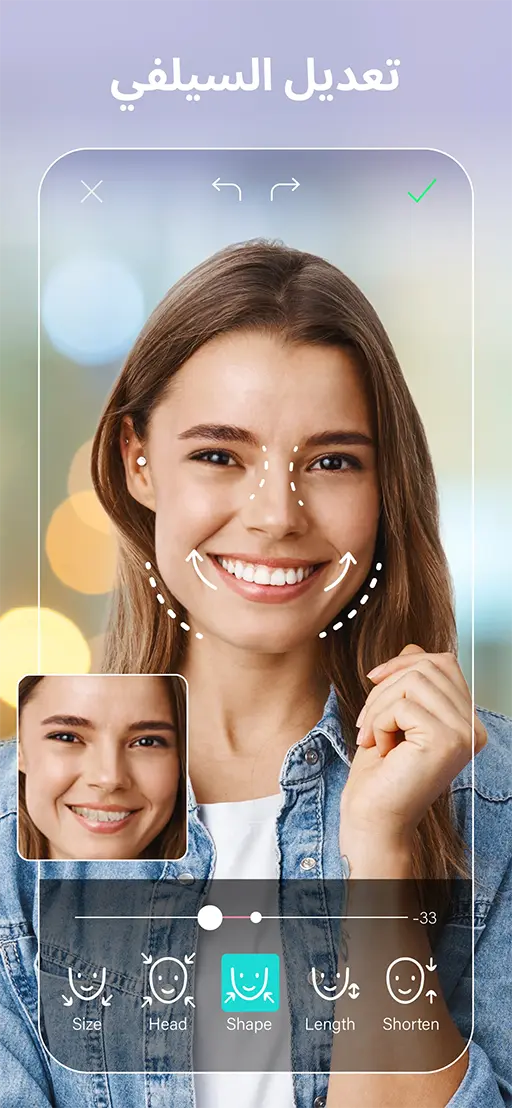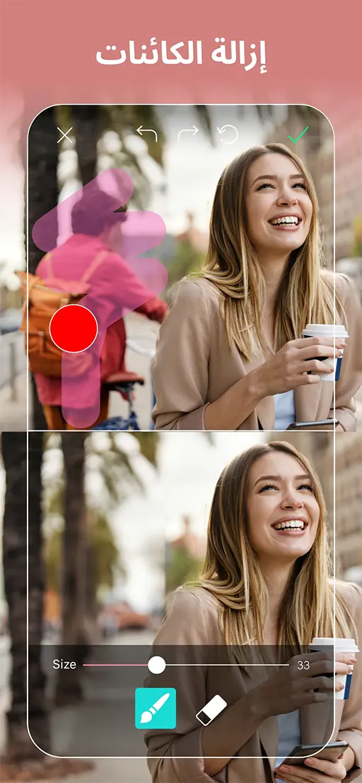 الصفحة الخاصة بالممحاة تتضمن زر التراجع الذي يمكنك استخدامه للتراجع عن أي تعديل، وزر إعادة التراجع لاسترجاع التعديل الذي تراجعت عنه، ويمتلك برنامج تعديل الصور YouCam Perfect AI Photo Editor أيضاً أداة خاصة بتجميل الجسم كاملاً وليس الوجه فحسب، مما يمنح صورك تحسيناً شاملاً وجذاباً بتصاميم بسيطة واحترافية في آن واحد.