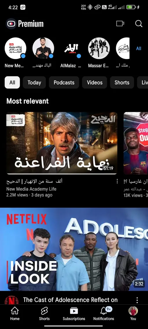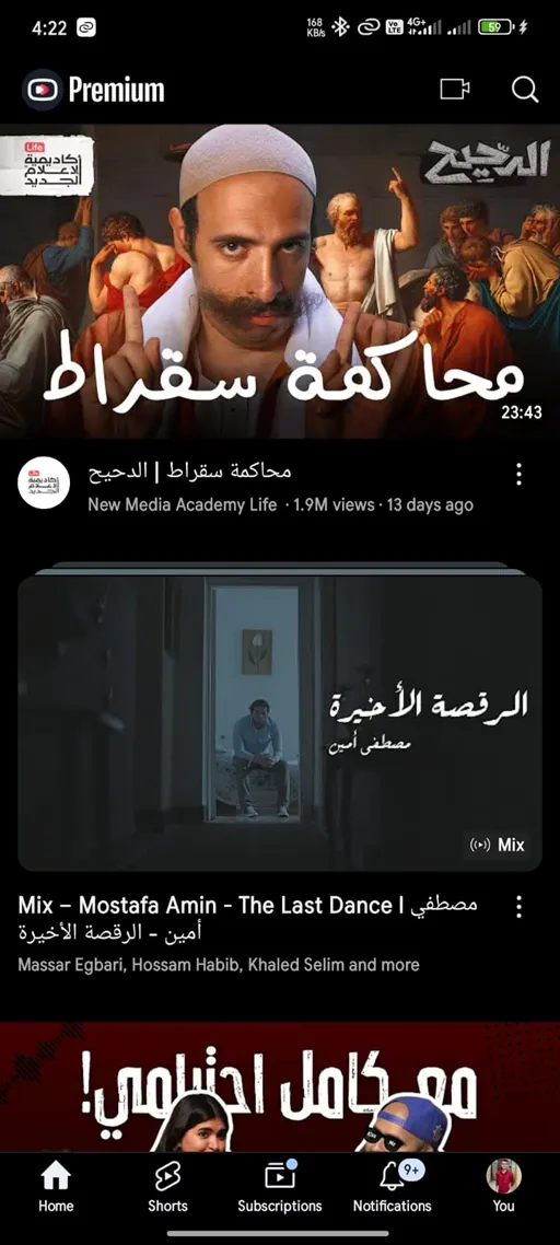 - مقاطع الفيديو الصغيرة Shorts : الصفحة الثانية وهي صفحة حديثة أي تتوفر منذ فترة قريبة في يوتيوب بريميوم أخر إصدار, تحتوي هذه الصفحة على مقاطع صغيرة تٌسمي بالـ Shorts وهذه المقاطع حديثة في اليوتيوب ومدتها لا تتخطي الدقيقة ومع الدخول لهذه الصفحة يمكنك التنقل بين المقاطع الموجودة عن طريق التمرير مثل تطبيق التيك توك أو الفيس بوك أو أي منصة أخرى, والمقاطع الصغيرة المعروضة تكون من إقتراحات التطبيق حسب تفضيلاتك أيضاً.