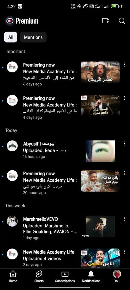 - الاشتراكات Subscriptions : ثالث الصفحات في الواجهة بعد تنزيل يوتيوب بريميوم اخر اصدار وهي صفحة أساسية لعرض المحتوى أو الفيديوهات المناسبة لك, أو بمعنى أقرب فـ في هذه الصفحة سوف تجد الفيديوهات المٌنشرة من الصفحات أو القنوات التي تقوم بمتابعتها أو القنوات التي قٌمت بالإشتراك فيها, فـ إن كٌنت ترى أن إقتراحات التطبيق لا تناسبك من حيث التصفح توجه إلى هذه الصفحة لتصل إلى أخر الإضافات من قنواتك.